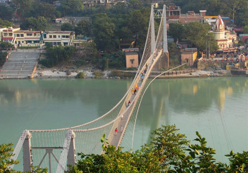 laxman jhula is an iron suspension bridge over holy river ganga at rishikesh . a famous landmark place in rishikesh , laxman jhula is 450 feet lenght connecting pauri district with tehri district . laxman jhula also offers a panoramic view of river ganga and rishikesh city having number of temples.